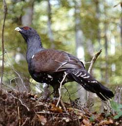 Глухар (Tetrao urogallus) Місця проживання Глухар - характерний мешканець хвойних лісів, причому все його життя дуже тісно зв'язане із хвойними. Хвоя служить йому основним джерелом корму в зимовий час, ягідники, що ростуть під покривом хвойних, особливо - чорничники відіграють велику роль у харчуванні влітку. Перевагу глухарі надають лісам з різноманітною екологічною обстановкою, таким, де є галявини, гарі, вирубки, болота. Глухар - осілий птах, і рідко переміщається більш, ніж на 30 кілометрів, а багато птахів проводять усе своє життя, не залишаючи ділянки радіусом 3 - 4 кілометри. Улітку глухарі літають дуже мало, більше вони пересуваються пішки, але якщо злітають, те нерідко летять над лісом, вище вершин дерев, тому що їхні великі розміри дозволяють їм не боятися хижаків. Самці-глухарі важать 4-5 кг (рідко 5,5 кг) і по-справжньому красиві. Чорна голова з бородою, червоні набряклі брови, зелений з металевим відтінком зоб, сіро-струминкова шия, коричневі крила і величезний чорний хвіст - такий зовнішній вигляд старого самця. Глухарка майже вдвічі менше самця, важить близько 2 - 2,5 кг, має скромне захисне буровато-охристе вбрання з чорними плямками. Біологія розмноження Глухар - типовий полігам із груповим характером токування. Розмноження глухарів - один з найцікавіших періодів у його житті. Вже в лютому-березні в глухарів починається шлюбне пожвавлення, коли самці починають демонструвати різні елементи свого ритуалу. Це може відбуватися в будь-якому місці, самці розвертають хвіст і розходжують один перед другим, залишаючи на снігу характерні ланцюжки слідів зі звивистими лініями від кінчиків напіврозкритих крил - "креслення". З початку квітня, коли в лісі починає танути сніг, уся токова активність глухарів зосереджена вже в дуже визначених, традиційних місцях - на токовищах, що, як правило, присвячені до прозорих спілих сосників, звичайно по краях великих верхових боліт, і дуже постійні протягом багатьох років і навіть десятиліть. На токовищах самці мають постійні ділянки, на яких вони виконують свою незвичайну пісню. У розпал співу сюди злітаються і самки. Самці починають співати на деревах, але в розпал періоду токування, коли з'являються самки, вони спускаються на землю, де і відбувається спарювання. Не всі самці, що прилетіли на токовище, співають, деякі, звичайно дворічного віку, відсиджуються мовчки. Прилітають на токовище самці з настанням темряви, а співають з ранку, перед світанком. Пісня складається з двох частин - "текання", що складається із серії тихих щигликів, і "точіння" - також тихих, чутних не далі 200 метрів, глухих скреготливих звуків, що тривають 2 - 3 секунди. Під час другої половини пісні завжди обережний глухар перестає реагувати на зовнішні звуки, що і лягло в основу його назви. Коли встає сонце, спів поступово затихає, і самці по черзі летять, щоб повернутися на наступний вечір. У середньому токовища нараховують 5 - 7 півнів. Закінчується період токування звичайно в першій декаді травня, але найбільше інтенсивне воно в другій половині квітня. У цей ж період самки починають будувати гнізда і відкладати яйця. Гнізда розташовані на землі і звичайно біля країв токовищ. Кладка містить, у середньому, 7-9 яєць палевого кольору з численними дрібними темними плямами. Насиджування починається перед відкладанням останнього яйця, звичайно це в